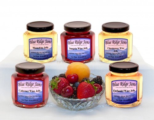 Blue Ridge Jams wine jellies are made from a variety of wines to produce six wonderful flavors. Wine Jellies go great on waffles, pancakes, crepes, croissants, and toast. Use them as an easy appetizer or as a glaze on meats. This variety pack includes Bordeaux Wine Jelly, Cabernet Wine Jelly, Chardonnay Wine Jelly, Merlot Wine Jelly, Moonshine Jelly, and Zinfandel Wine Jelly.