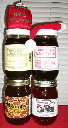 Pint of MayHaw Jelly, Pint of Ribbon Cane Table Syrup, Pint of Sorghum Molasses Syrup, Pint of Pure Oakatoma River Honey