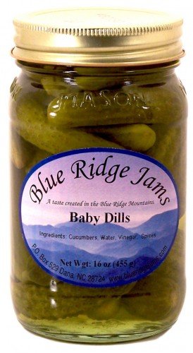 Crunchy baby dill pickles have the same zesty taste as the whole pickle but come in a smaller size. Homemade dill pickles are a favorite low calorie snack food. Use on your sandwiches to make a delicious crunky treat or simply eat straight out of the jar. This baby dill pickle will surprise you that such a wonderful flavor comes out of such a petite size. Blue Ridge Jams Gourmet pickles are hand packed and cooked the old fashioned way to ensure the best quality products with an excellent taste. Ingredients: Cucumbers, Water, Vinegar, Spices